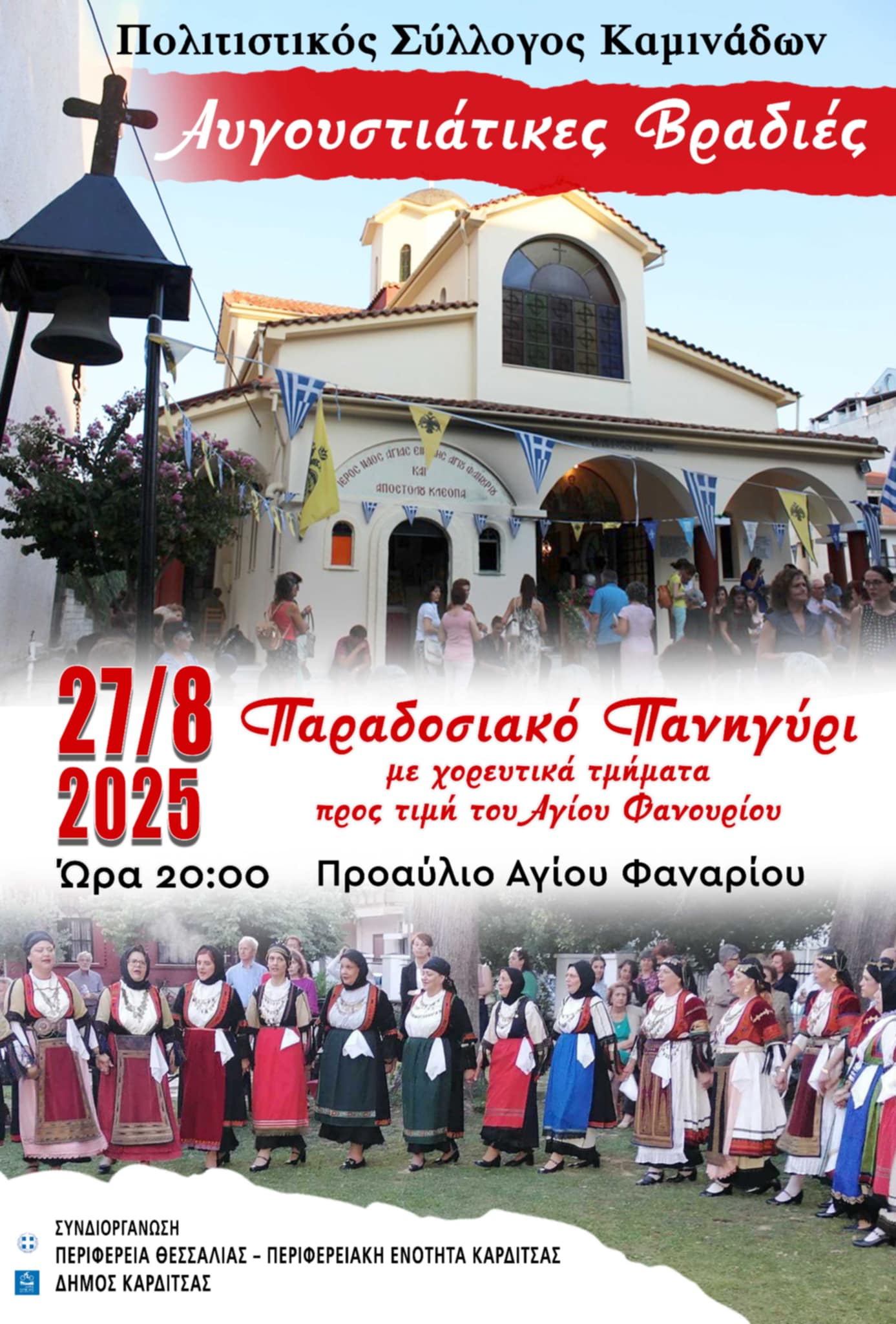 Την Τετάρτη, 27 Αυγούστου 2025, στις 20:00, θα εμφανιστούν παραδοσιακά χορευτικά τμήματα του Συλλόγου Καμινάδων στο προαύλιο του Αγίου Φανουρίου (Συνδιοργάνωση με την Περιφέρεια Θεσσαλίας – Περιφερειακή Ενότητα Καρδίτσας)