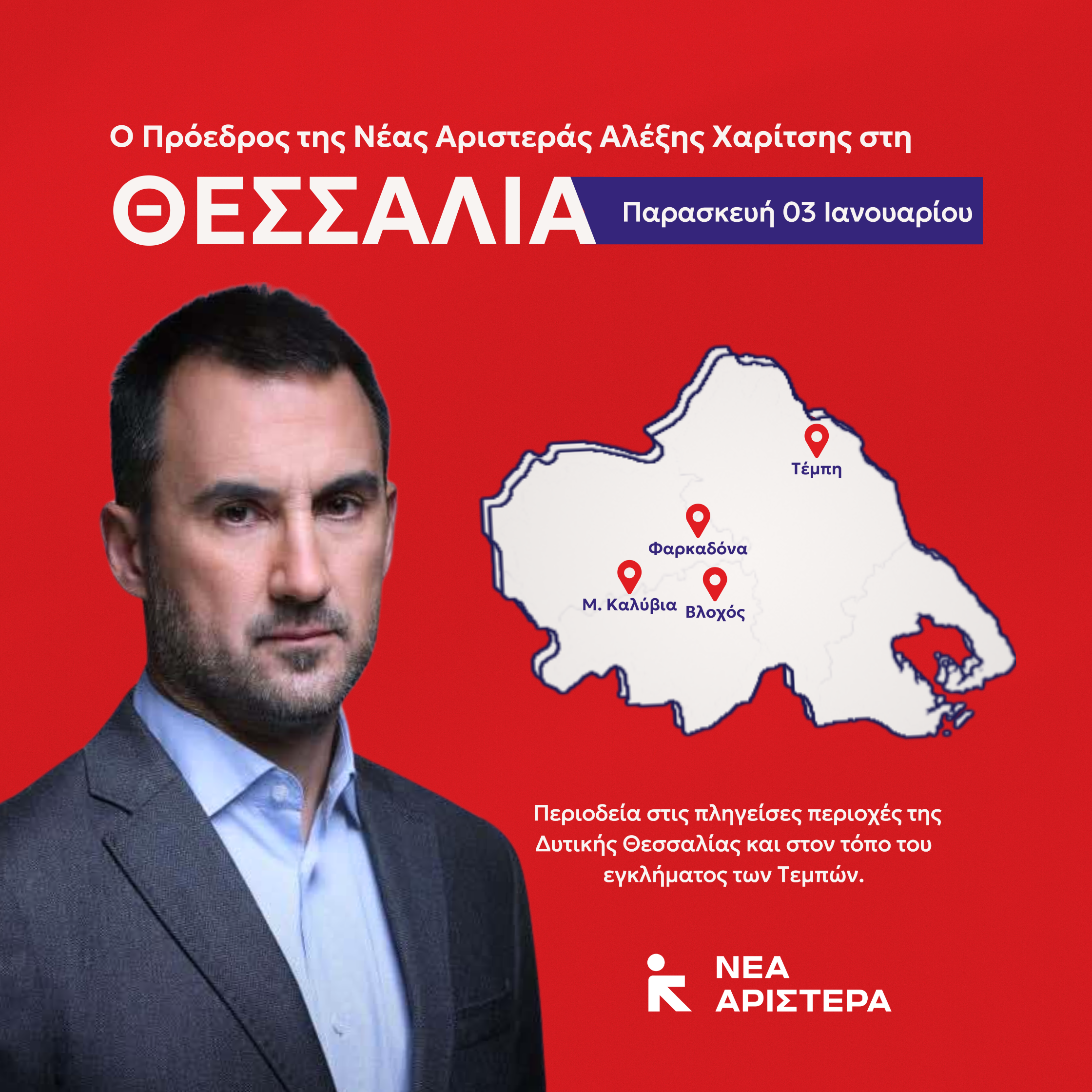 “Έναν χρόνο μετά”, περιοδεία Αλέξη Χαρίτση προέδρου Νέας Αριστεράς στις πλημμυροπαθείς περιοχές, ΠΕ Καρδίτσας και Τρικάλων την Παρασκευή 3/1/2025