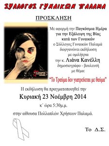 Με αφορμή την Παγκόσμια Ημέρα για την Εξάλειψη της Βίας κατά των Γυναικών ο Σύλλογος Γυναικών Παλαμά με σκοπό να τιμήσουμε την ημέρα, να ενημερώσουμε, να ευαισθητοποιήσουμε και να θυμίσουμε στις γυναίκες να μην σωπαίνουν και να αναδείξουμε το θέμα διοργανώνουμε εκδήλωση, την Κυριακή 23 Νοεμβρίου στο «κέντρο Πολλαπλών Χρήσεων Παλαμά» στις 17:30 το απόγευμα. …
