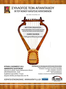 Μεγάλη μουσική εκδήλωση οργανώνει ο Σύλλογος των Απανταχού Καρδιτσιωτών στην Αθήνα, στις 9 Νοεμβρίου, με τον πανελληνίως γνωστό τραγουδιστή και μουσικοσυνθέτη ΛΑΚΗ ΧΑΛΚΙΑ και με θέμα «2.500 χρόνια Ελληνική μουσική» Η εκδήλωση θα είναι αφιερωμένη στην Ελληνική μουσική κι έχει σαν σκοπό να πληροφορήσει και να ευαισθητοποιήσει τους νέους μας και εν γένει τον κόσμο …