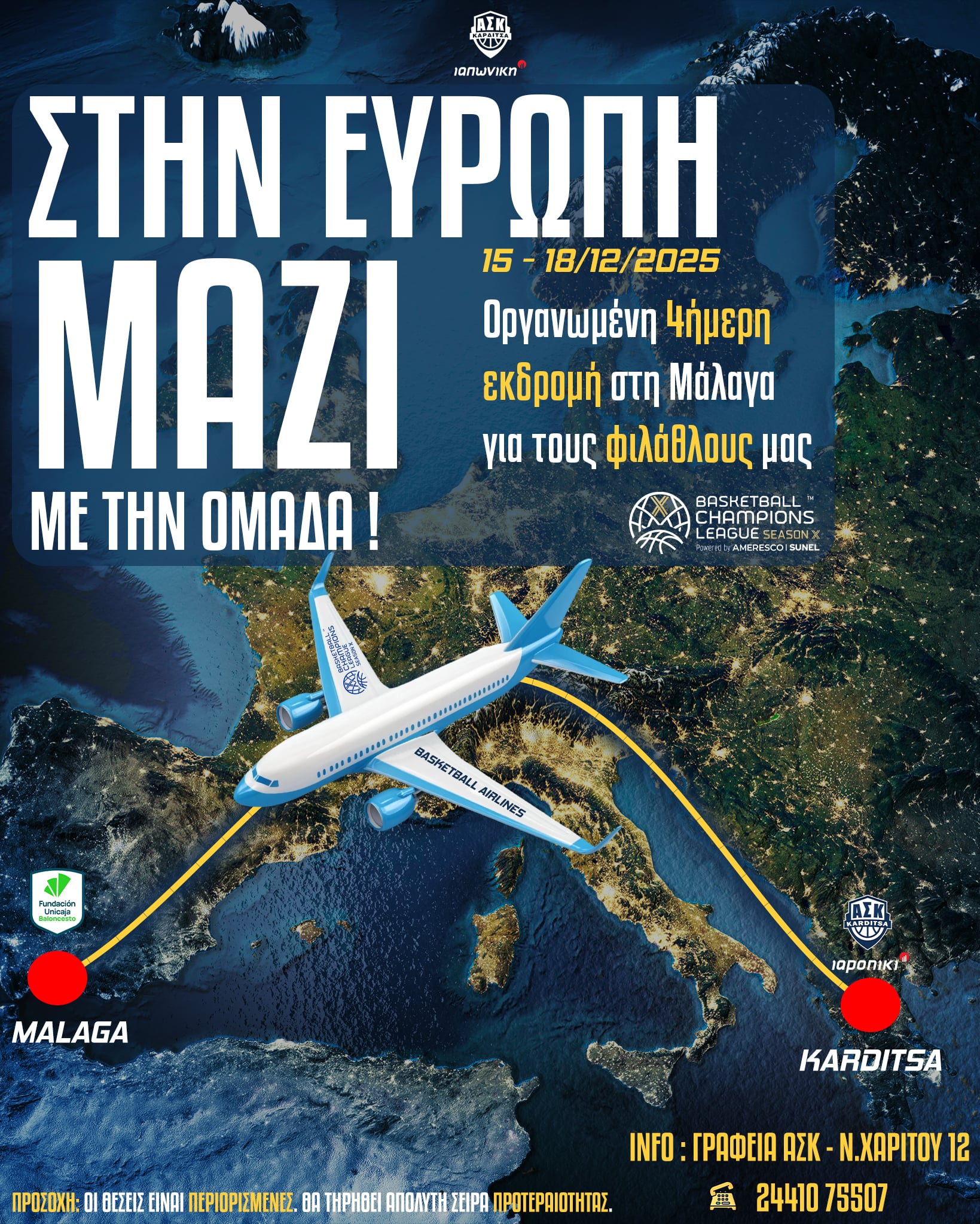 Ο Α.Σ. Καρδίτσας ΙΑΠΩΝΙΚΗ, δίνει τη δυνατότητα στους φιλάθλους ταξιδέψουν στην Μάλαγα για τον αγώνα του Basketball Champions League με την Unicaja Malaga στις 17 Δεκεμβρίου !!! Η τετραήμερη εκδρομή οργανώνεται με πρωτοβουλία του ΑΣΚ σε συνεργασία με το Caravel Travel και περιλαμβάνει τα αεροπορικά εισιτήρια, τις εσωτερικές μεταφορές και τη διαμονή από τη Δευτέρα …