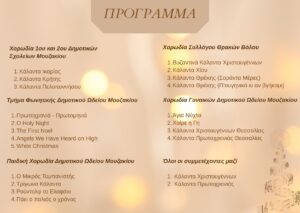 Η συναυλία εντάσσεται στο πλαίσιο των εορταστικών εκδηλώσεων του Τεχνόδρομου και θα περιλαμβάνει χριστουγεννιάτικο μουσικό πρόγραμμα από τους μαθητές και τους καθηγητές του Δημοτικού Ωδείου Μουζακίου.