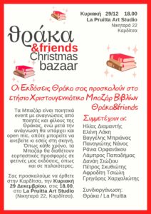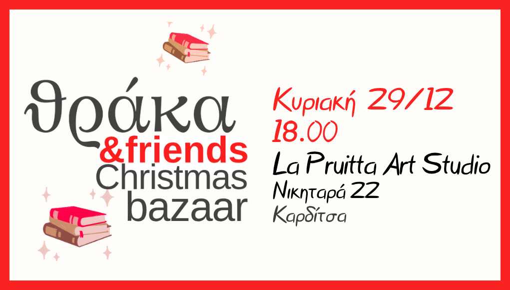 Οι Εκδόσεις Θράκα σας προσκαλούν στο ετήσιο Χριστουγεννιάτικο Μπαζάρ Βιβλίων Θράκα & friends.  Τα Μπαζάρ είναι ποιητικά event με αναγνώσεις από ποιητές και φίλους της Θράκας, ενώ μετά την ανάγνωση θα υπάρχει και open mic, οπότε μπορείτε να ανεβείτε κι εσείς στη σκηνή. Τα Χριστουγεννιάτικα Μπαζάρ της Θράκας πραγματοποιούνται κάθε χρόνο στην Αθήνα, τη Θεσσαλονίκη, την Λάρισσα και την Καρδίτσα. Όπως κάθε χρόνο, τα Μπαζάρ θα διαθέτουν εορταστικές προσφορές σε φετινές μας εκδόσεις, όπως και σε παλαιότερες.