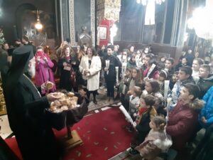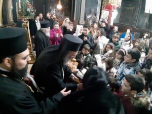 Ο Σεβασμιώτατος Μητροπολίτης μας συγκινημένος από αυτή την ευχάριστη επίσκεψη των παιδιών για να του ευχηθούν, τους απηύθυνε εγκάρδιες ευχές αγάπης και στοργής.
