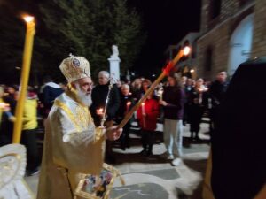Στις 12:00 τα μεσάνυχτα, ο Σεβασμιώτατος προεξήρχε της τελετής της Αναστάσεως, κατά την οποία αντήχησε πανηγυρικά το «Χριστός Ανέστη», μεταδίδοντας σε όλους το ανέσπερο φως και την ανεκλάλητη χαρά της Αναστάσεως του Κυρίου. Οι πιστοί, με αναμμένες λαμπάδες, έλαβαν το Άγιο Φως και αντάλλαξαν τον ασπασμό της αγάπης, βιώνοντας το μυστήριο της Αναστάσεως ως προσωπική και εκκλησιαστική εμπειρία.