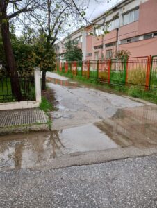Γνωρίζουμε ότι από χρόνια η αρμόδια υπηρεσία του Δήμου, η ΔΕΥΑΚ και η δημοτική αρχή γνωρίζουν το πρόβλημα. Ο Σύλλογος μας, ανάμεσα σε άλλα, τον Ιανουάριο ενημέρωσε τη Διεύθυνση του σχολείου, η οποία με τη σειρά της απέστειλε έγγραφο στο Δήμο για το θέμα του πεζοδρόμου που πλημμυρίζει κάθε φορά με μια μικρή βροχή και μέχρι σήμερα περιμένουμε απαντήσεις.