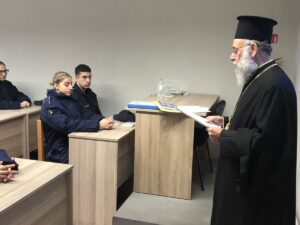 Εκεί είχε την ευκαιρία να απευθύνει διδαχή στους και στις δοκίμους αστυφύλακες, προσφέροντας πνευματικό προβληματισμό και καθοδήγηση πάνω στο επίκαιρο και ιδιαίτερα σημαντικό θέμα «Θρησκευτικός Φονταμενταλισμός».