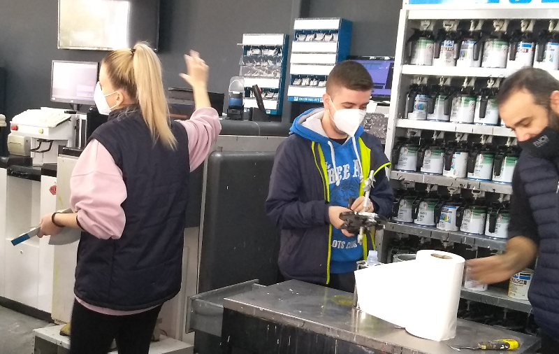 Παρακολούθησαν τη γραμμή παραγωγής ελαιοχρωμάτων στο κατάστημα «Σφήκας» στην Αλ. Παπαναστασίου στον Περιφερειακό, όπου τους υποδέχθηκαν ο Νίκος, η Χρύσα και ο Γιώργος Σφήκας.