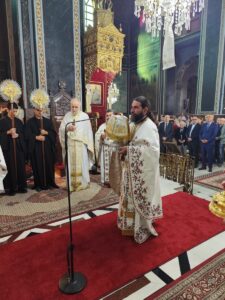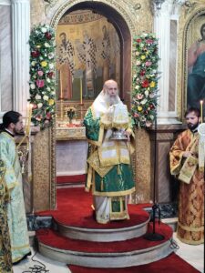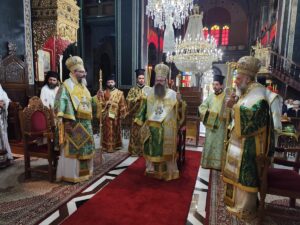 Στις 7:00 π.μ. τελέσθηκε η Ακολουθία του Όρθρου και η Θεία Λειτουργία, προεξάρχοντος του Σεβασμιωτάτου Μητροπολίτου Μεγάρων και Σαλαμίνος κ. Κωνσταντίνου και συλλειτουργούντων του Σεβασμιωτάτου Μητροπολίτου Παραμυθίας, Φιλιατών, Γηρομερίου και Πάργας κ. Σεραπίωνος και του Σεβασμιωτάτου Ποιμενάρχου μας κ. Τιμοθέου.