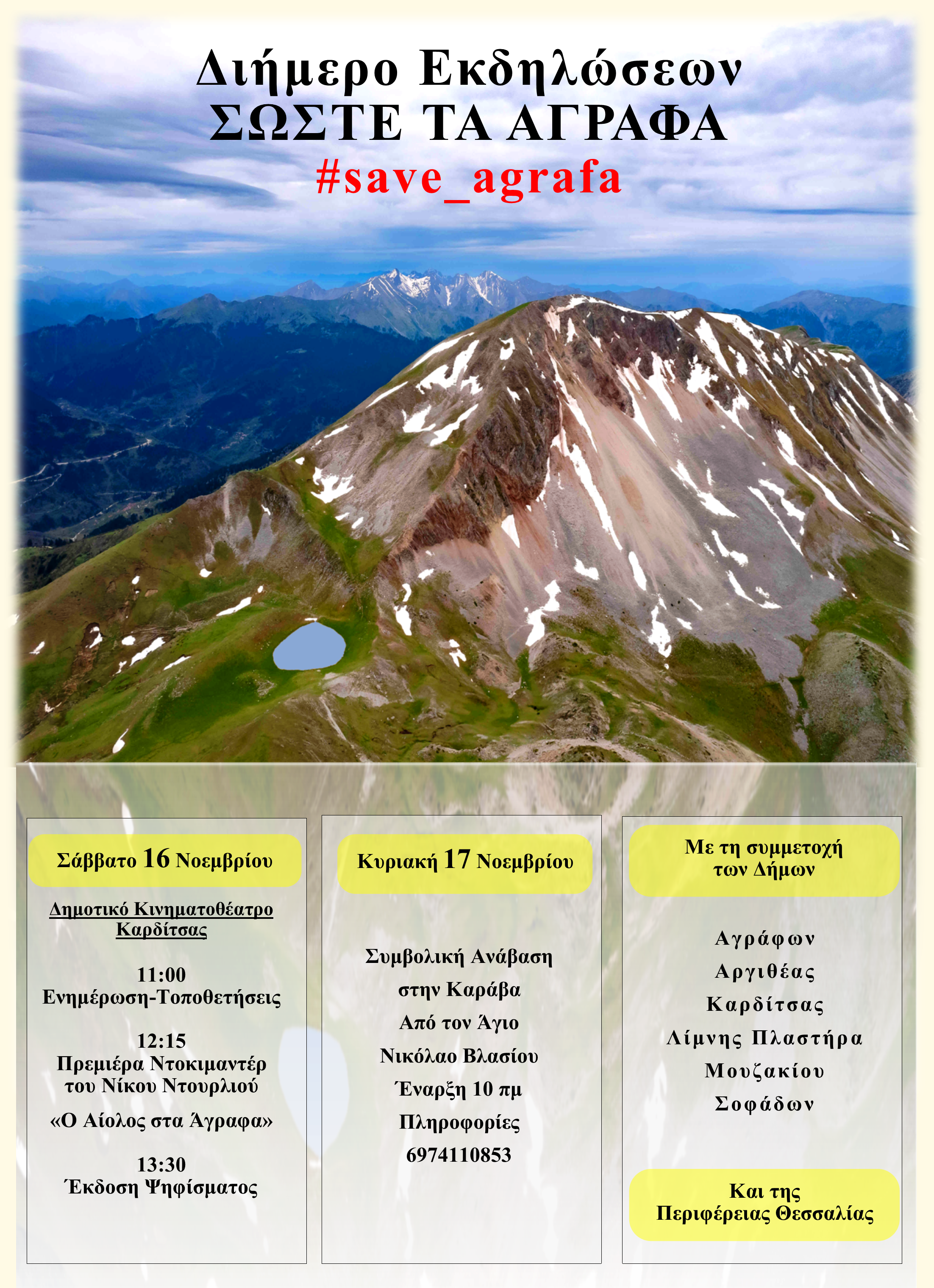 Το επόμενο Σαββατοκύριακο 16 και 17 Νοεμβρίου πραγματοποιούνται στην Καρδίτσα εκδηλώσεις για την προστασία των Αγράφων με την συμμετοχή των Δήμων ΑΓΡΑΦΩΝ, ΑΡΓΙΘΕΑΣ, ΚΑΡΔΙΤΣΑΣ, ΛΙΜΝΗΣ ΠΑΣΤΗΡΑ, ΜΟΥΖΑΚΙΟΥ και ΣΟΦΑΔΩΝ καθώς και την συμμετοχή της ΠΕΡΙΦΕΡΕΙΑΣ ΘΕΣΣΑΛΙΑΣ Π.Ε.ΚΑΡΔΙΤΣΑΣ.