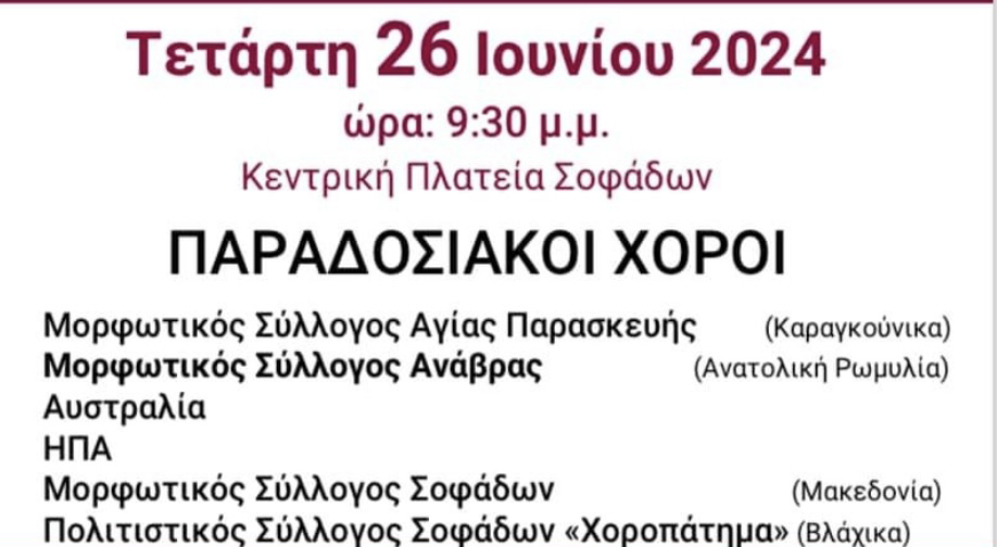 – Κεντρική Πλατεία Σοφάδων, ώρα 9:30μ.μ. εκδήλωση με παραδοσιακούς χορούς από τον Μορφωτικό Σύλλογο Σοφάδων (Μακεδονία), τον Πολιτιστικό Σύλλογο Σοφάδων “Χοροπάτημα” (Βλάχικα), τον Μορφωτικό Σύλλογο Αγίας Παρασκευής (Καραγκούνικα), τον Μορφωτικό Σύλλογο Ανάβρας (Ανατολική Ρωμυλία) και τα χορευτικά συγκροτήματα από το Αϊντάχο των ΗΠΑ (συγκρότημα «IdahoRockyMountain Express») και το Συγκρότημα της Ελληνικής ομογένειας στην Μελβούρνη της Αυστραλίας «ΜANASIS School of Greek Dance and Culture».