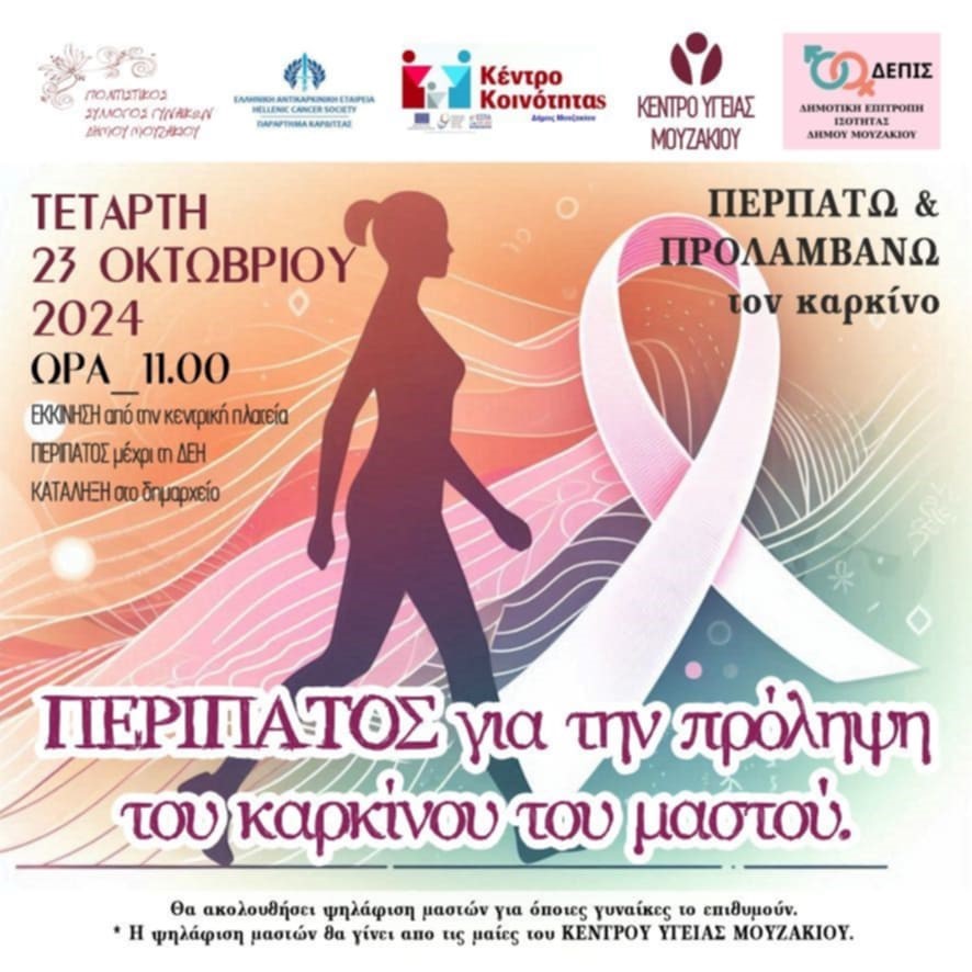 Οι φορείς του Δήμου Μουζακίου, το Κέντρο Κοινότητας και η Δημοτική Επιτροπή Ισότητας, σε συνεργασία με την Ελληνική Αντικαρκινική Εταιρία Παράρτημα Καρδίτσας, τον Πολιτιστικό Σύλλογο Γυναικών Μουζακίου και το Κέντρο Υγείας Μουζακίου, συνδιοργανώνουν δράση ενημέρωσης και ευαισθητοποίησης του κοινού για την πρόληψη του Καρκίνου του Μαστού.
