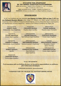 Ο Σύλλογος των απανταχού εκ του Νομού Καρδίτσας καταγομένων οργανώνει την Κυριακή, 25 Μαϊου 2025 και ώρα 11.30 π.μ.’ στο Πολεμικό Μουσείο Αθηνών (οδ. Ριζάρη 2-4& Λεωφ. Βασιλίσσης Σοφίας, ΑΘΗΝΑ), ειδική τιμητική εκδήλωση που οργανώνει, υπό την αιγίδα του Υπουργείου Εθνικής Άμυνας, για τους Σύγχρονους Ήρωες συμπατριώτες μας Καρδιτσιώτες πεσόντες ιπτάμενους-πιλότους των Ενόπλων Δυνάμεων της Χώρας μας: