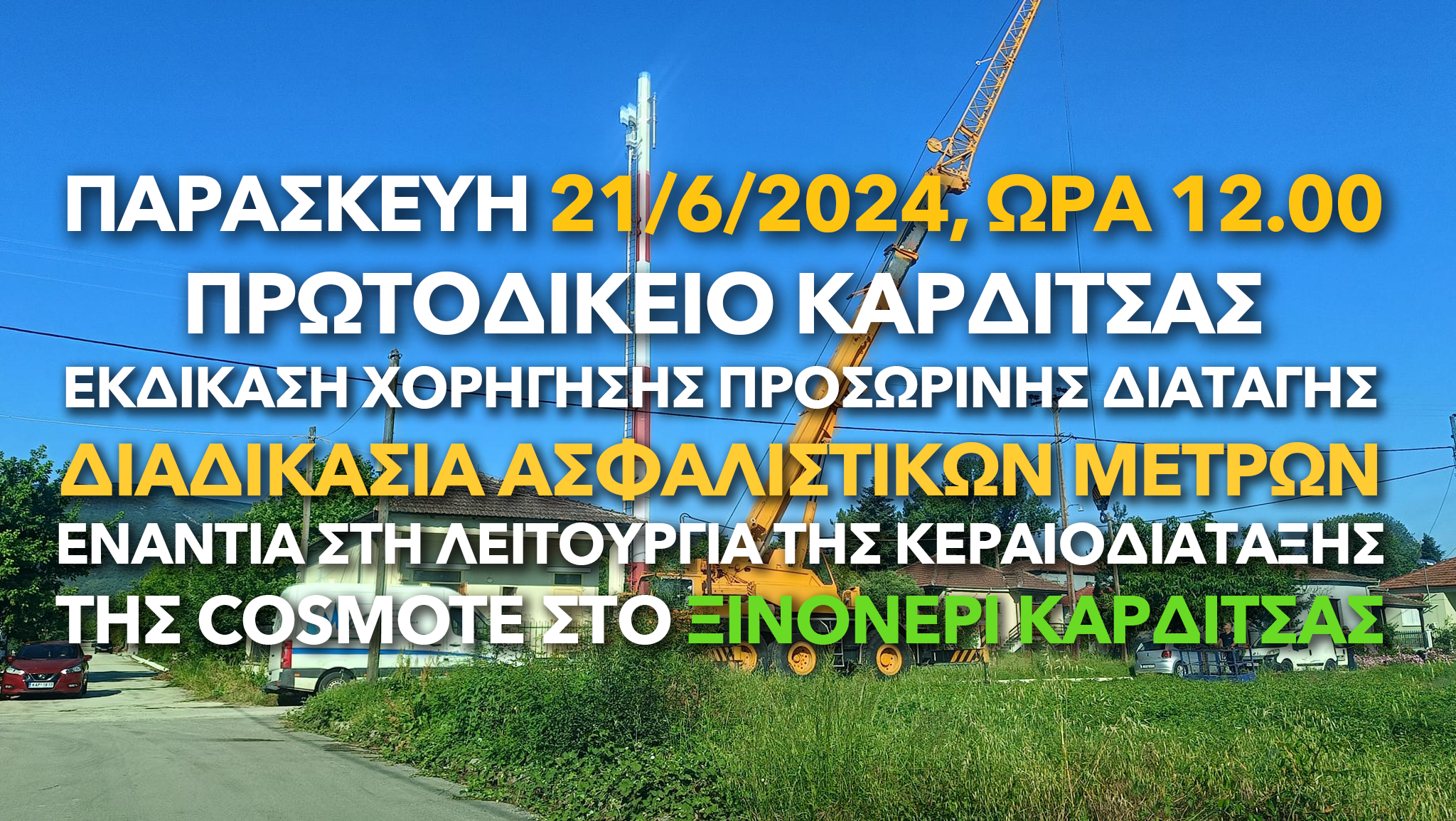 Ανακοινώνουμε ότι την ερχόμενη Παρασκευή 21/6/2024 και ώρα 12:00 εκδικάζεται στο Μονομελές Πρωτοδικείο Καρδίτσας η αίτηση ασφαλιστικών μέτρων (με επίκληση του κατεπείγοντος), που κατατέθηκε την Παρασκευή 14/6/2024 ενάντια στην εγκατάσταση και λειτουργία της κεραιοδιάταξης της COSMOTE καταμεσής του Ξινονερίου Καρδίτσας.