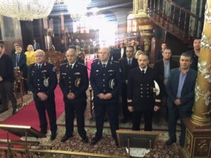 - στα Τρίκαλα, χοροστάτησε ο Σεβασμιώτατος Μητροπολίτης Τρίκκης, Γαρδικίου και Πύλης, κ.κ. Χρυσόστομος, ενώ παρέστησαν ο Πρωτοσύγκελος της Ιεράς Μητρόπολης, Αρχιμανδρίτης π. Αλέξιος Κάνινας, η Βουλευτής Τρικάλων, Μαρίνα Κοντοτόλη, η Εισαγγελέας Πρωτοδικών Τρικάλων, Αγορή Παπακώστα, ο Αντιπεριφερειάρχης Τρικάλων, Χρήστος Μιχαλάκης, οι Θεματικοί Αντιπεριφερειάρχες Κωνσταντίνος Μπάρδας και Χρήστος Γακόπουλος, ο Δήμαρχος Τρικκαίων, Νικόλαος Σακκάς, ο Αντιδήμαρχος του Δήμου Φαρκαδόνας, Γεώργιος Γεωργίου, η ο Συνταγματάρχης Βασίλειος Τζερεμάκης, ως εκπρόσωπος της Σχολής Μονίμων Υπαξιωματικών (Σ.Μ.Υ.), ο Διοικητής της Πυροσβεστικής Υπηρεσίας Τρικάλων, Αντιπύραρχος Δημήτριος Παπαγεωργίου, ο Διευθυντής της Πρωτοβάθμιας Εκπαίδευσης Τρικάλων, Χρήστος Τρικάλης, ο Πρόεδρος Αστικής Ανάπτυξης, Γεώργιος Ζιώγας, ο Πρόεδρος της Ένωσης Αστυνομικών Υπαλλήλων Τρικάλων, Ιωάννης Αναγνώστου, ο Πρόεδρος του Δικηγορικού Συλλόγου Τρικάλων, Νικόλαος Γουγουλάκης, ο Πρόεδρος της Ισραηλιτικής Κοινότητας Τρικάλων, Ιακώβ Βενουζίου, ο κ. Απόστολος Κόκκοβας, ως εκπρόσωπος του Προέδρου του Επιμελητηρίου Τρικάλων, ο Πρόεδρος Αποστράτων Αστυνομικών νομού Τρικάλων, Ιωάννης Διαμαντής, ο Πρόεδρος της Διεθνούς Ένωσης Αστυνομικών (Ι.Ρ.Α.) – Παραρτήματος Τρικάλων, Βασίλειος Δραγούτσος, ο Πρόεδρος του Συνδέσμου Αποφοίτων Υπαξιωματικών Σ.Μ.Υ., Ευάγγελος Στέφος, η Προϊσταμένη της Δημοτικής Αστυνομίας Τρικάλων, Ευαγγελία Κοντογιάννη, απόστρατοι καθώς και εν ενεργεία αστυνομικοί &