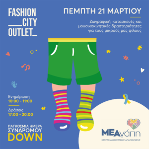 Στις 21 Μαρτίου όπως κάθε χρόνο η φωνή των ατόμων με σύνδρομο Down και εκείνων που ζουν καθημερινά μαζί τους, μεγαλώνει και ακούγεται πιο δυνατά! Το Fashion City Outlet ενισχύει ακόμη περισσότερο αυτή την φωνή με ενημερωτική εκδήλωση και βιωματικές δράσεις που θα πραγματοποιηθούν αύριο Πέμπτη 21 Μαρτίου με στόχο να ενημερώσει, να ευαισθητοποιήσει και να διασκεδάσει όσους θα συμμετάσχουν σε αυτή την δράση που γίνεται σε συνεργασία με το ΚΔΑΠ ΜΕΑγάπη Λάρισας.