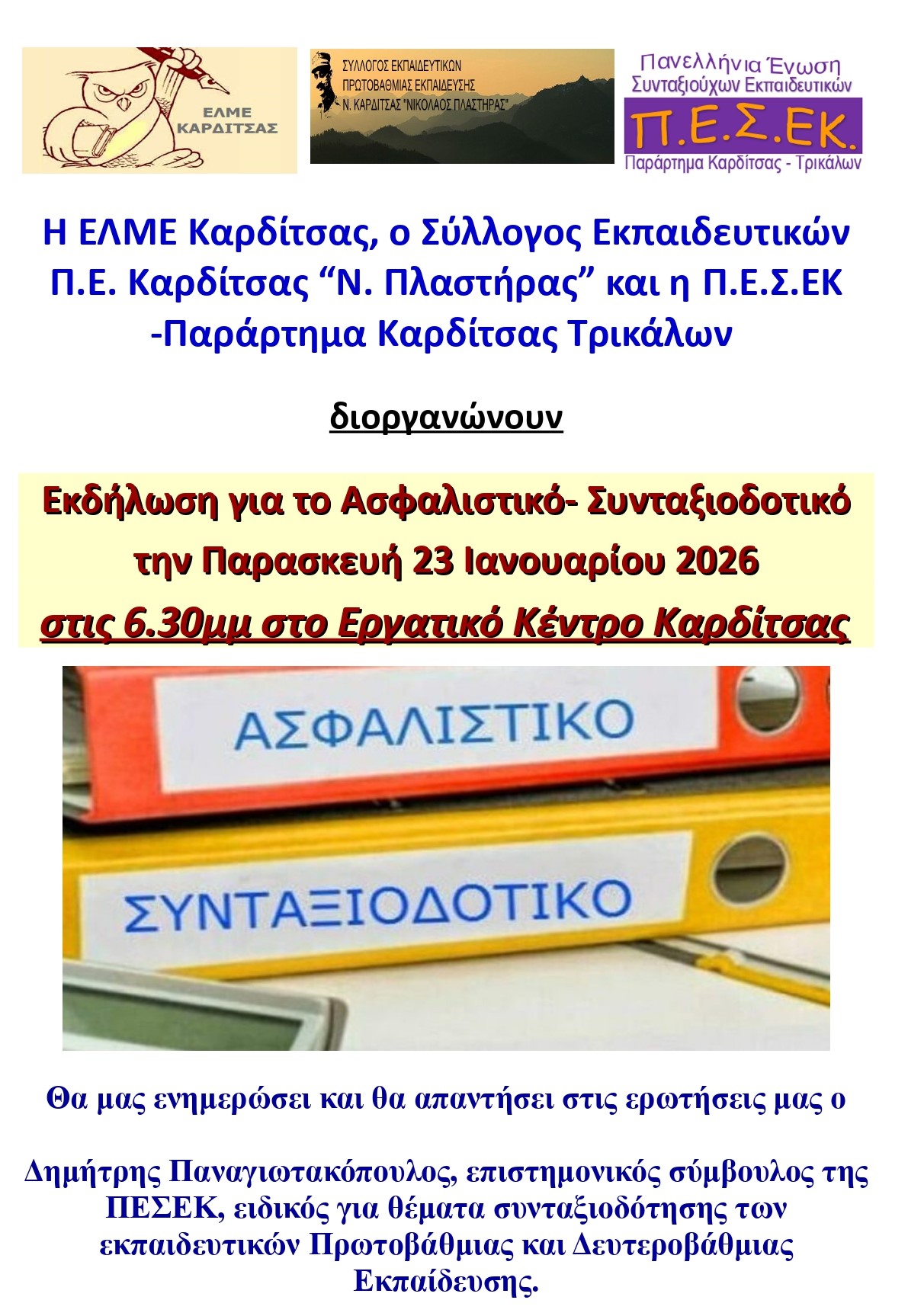 Η ΕΛΜΕ Καρδίτσας, ο Σύλλογος Εκπαιδευτικών Π.Ε. Καρδίτσας “Ν. Πλαστήρας” και η Π.Ε.Σ.ΕΚ -Παράρτημα Καρδίτσας Τρικάλων διοργανώνουν Εκδήλωση για το Ασφαλιστικό- Συνταξιοδοτικό την Παρασκευή 23 Ιανουαρίου 2026 στις 6.30μμ στο Εργατικό Κέντρο Καρδίτσας.