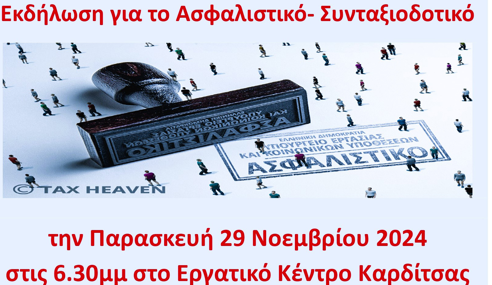 Η ΕΛΜΕ Καρδίτσας και ο Σύλλογος Εκπαιδευτικών Π.Ε. Καρδίτσας “Ν. Πλαστήρας” διοργανώνουν εκδήλωση για το Ασφαλιστικό – Συνταξιοδοτικό την Παρασκευή 29 Νοεμβρίου 2024 στις 6.30μμ στο Εργατικό Κέντρο Καρδίτσας.