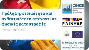 Ο Σύνδεσμος Βιομηχανιών Θεσσαλίας & Στερεάς Ελλάδος ΣΒΘΣΕ σε συνεργασία με το Ελληνικό Ινστιτούτο Υγιεινής και Ασφάλειας της Εργασίας ΕΛΙΝΥΑΕ, σας προσκαλεί σε Ενημερωτική Εκδήλωση με θέμα: «Πρόληψη, ετοιμότητα και ανθεκτικότητα απέναντι σε φυσικές καταστροφές- Προκλήσεις και Προτεραιότητες» η οποία θα πραγματοποιηθεί την Παρασκευή 10 Νοεμβρίου 2023 και ώρα 17:00 – 20:30, στην έδρα του Επιμελητηρίου Μαγνησίας, Δημητριάδος 176, στο Βόλο.