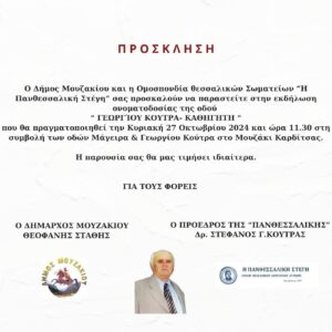 Ο Δήμος Μουζακίου και η Ομοσπονδία Θεσσαλικών Σωματείων “Η Πανθεσσαλική Στέγη” σας προσκαλούν να παραστείτε στην εκδήλωση ονοματοδοσίας της οδού “ΓΕΩΡΓΊΟΥ ΚΟΥΤΡΑ- ΚΑΘΗΓΗΤΗ” που θα πραγματοποιηθεί την Κυριακή 27 Οκτωβρίου 2024 και ώρα 11.30 π.μ. στη συμβολή των οδών Μάγειρα & Γεωργίου Κούτρα στο Μουζάκι Καρδίτσας.