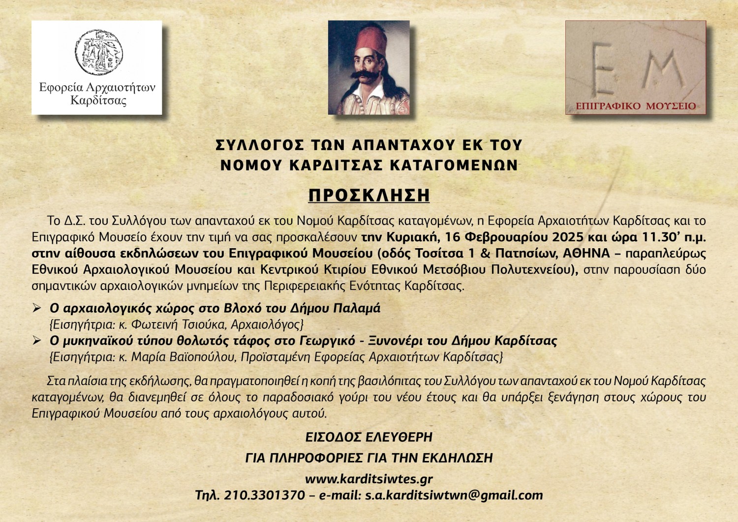 Ο Σύλλογος των απανταχού εκ του Νομού Καρδίτσας καταγομένων, σε συνεργασία με την Εφορεία Αρχαιοτήτων Καρδίτσας και το Επιγραφικό Μουσείο, οργανώνει την προσεχή Κυριακή, 16 Φεβρουαρίου 2025 και ώρα 11.30’ π.μ. στην αίθουσα εκδηλώσεων του Επιγραφικού Μουσείου (οδός Τοσίτσα 1& Πατησίων, ΑΘΗΝΑ – παραπλεύρως Εθνικού Αρχαιολογικού Μουσείου και Κεντρικού Κτιρίου Εθνικού Μετσόβιου Πολυτεχνείου), εκδήλωση παρουσίασης δύο σημαντικών αρχαιολογικών μνημείων της Περιφερειακής Ενότητας Καρδίτσας: