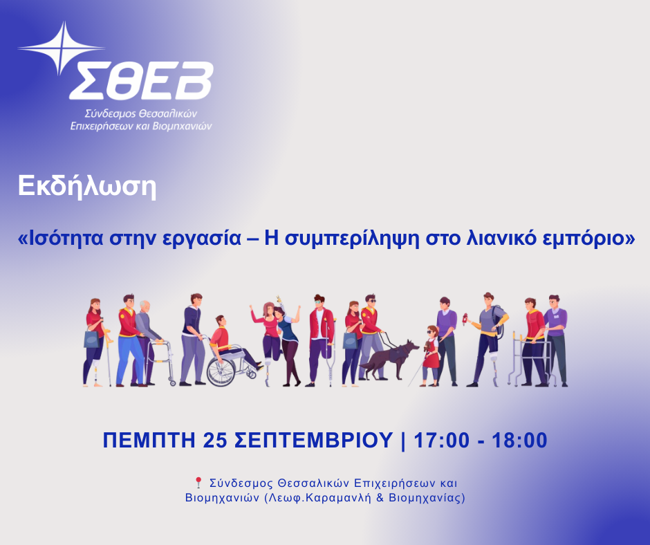 Ο Σύνδεσμος Θεσσαλικών Επιχειρήσεων και Βιομηχανιών (ΣΘΕΒ) σε συνεργασία με το Κέντρο Δια Βίου Μάθησης ΚΑΙΝΟΤΟΜΙΑ διοργανώνει ενημερωτική εκδήλωση με θέμα: «Ισότητα στην εργασία – Η συμπερίληψη στο λιανικό εμπόριο», η οποία θα πραγματοποιηθεί την Πέμπτη 25 Σεπτεμβρίου 2025, και ώρα 17:00 – 18:00, στις εγκαταστάσεις του ΣΘΕΒ (Λεωφόρος Καραμανλή & Βιομηχανίας, 1ος όροφος).