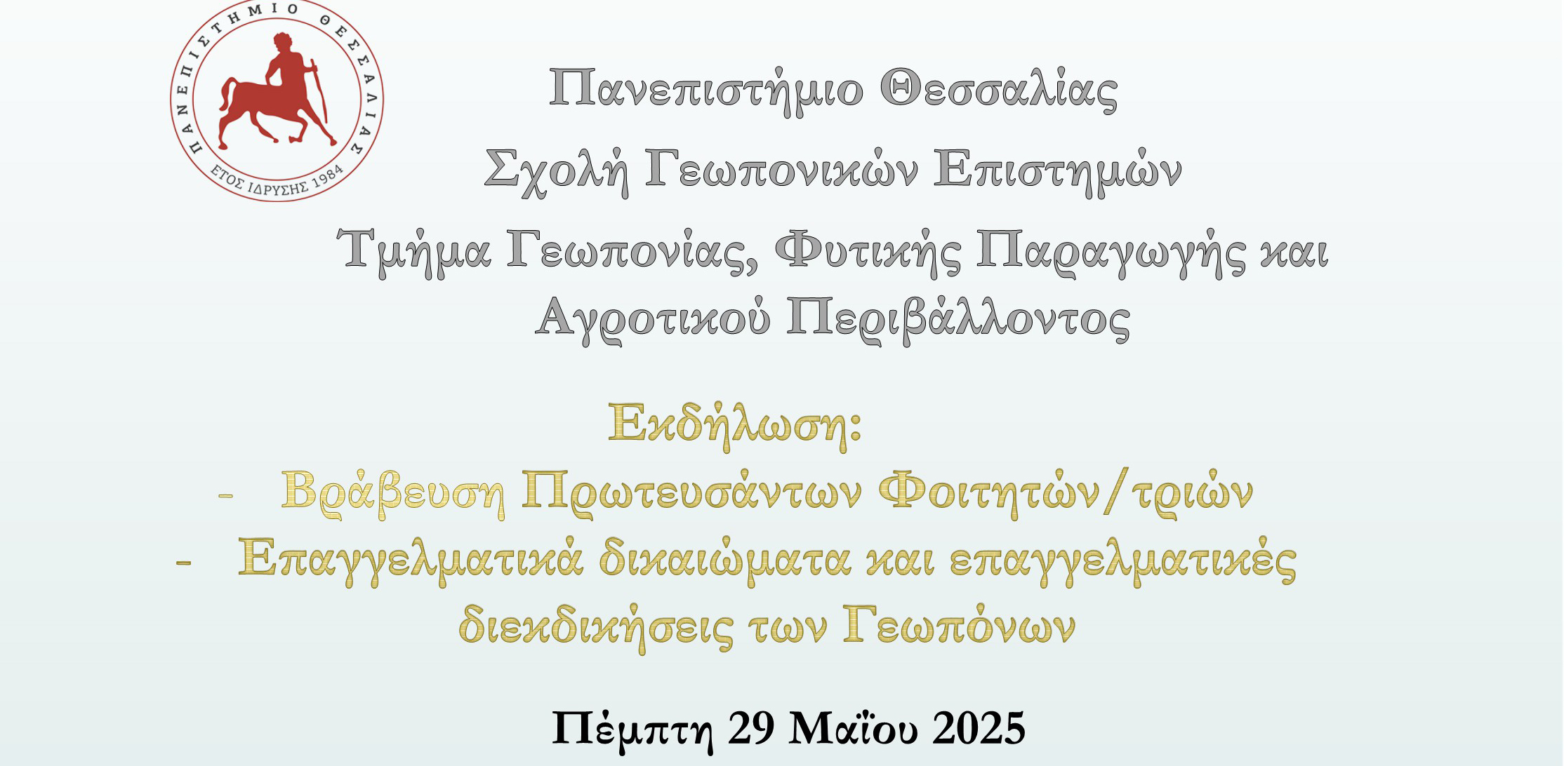 Η εκδήλωση θα πραγματοποιηθεί την Πέμπτη 29 Μαΐου 2025 και ώρα 13:00 στο Κεντρικό Αμφιθέατρο της Σχολής Γεωπονικών Επιστημών, Οδός Φυτόκου, Νέα Ιωνία, Βόλος.