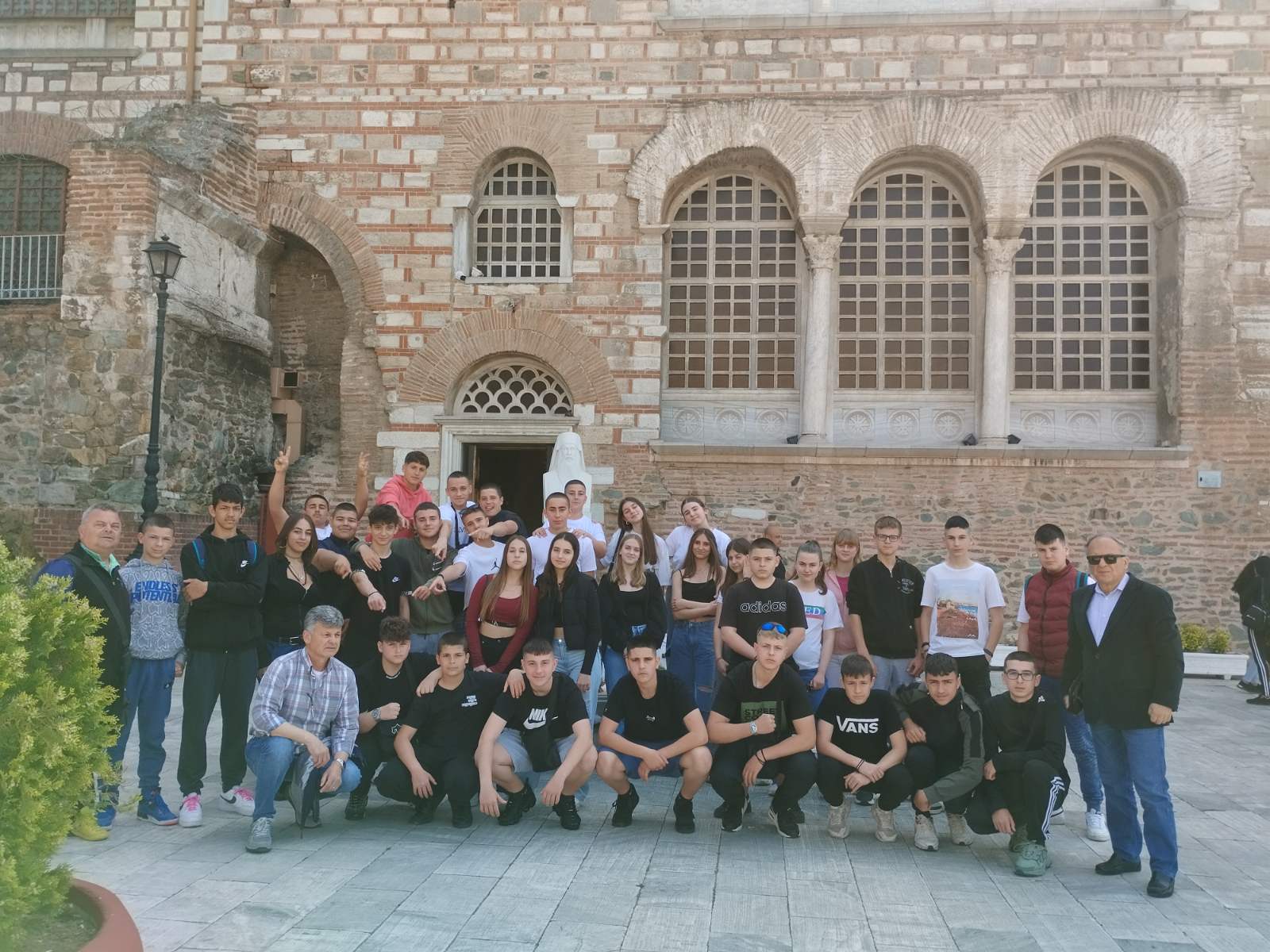 Οι μαθητές της Α΄ και της Γ΄ τάξης επισκέφθηκαν αρχικά τον Ιερό Ναό του Αγίου Δημητρίου και ξεναγήθηκαν στην κρύπτη του ναού κάτω από το Άγιο Βήμα. Εκεί διατηρείται το ρωμαϊκό λουτρό, όπου κατά την εκκλησιαστική παράδοση φυλακίστηκε, βασανίστηκε και μαρτύρησε ο Άγιος Δημήτριος. Στη συνέχεια οι μαθητές περιηγήθηκαν στη νέα παραλία κάνοντας μία στάση στον Λευκό Πύργο, το σήμα κατατεθέν της πόλης. Επόμενος σταθμός το εμπορικό κέντρο Cosmos για ξεκούραση και φαγητό.
