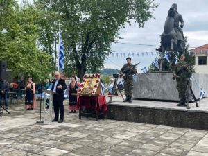 Ακολούθως, προέστη της Λιτανείας της εικόνος του Αγίου Γεωργίου του Τροπαιοφόρου έως την κεντρική πλατεία της Τ.Κ. Μαυρομματίου, όπου τέλεσε επιμνημόσυνη δέηση ενώπιον του έφιππου ανδριάντα του τιμωμένου ήρωος, αποδίδοντας τον οφειλόμενο φόρο τιμής και ευγνωμοσύνης προς την προσφορά του στον αγώνα της εθνικής παλιγγενεσίας.