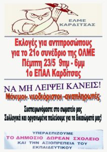 Οι εκλογές για την ανάδειξη εκπροσώπων για το 21ο συνέδριο της ΟΛΜΕ από την ΕΛΜΕ Καρδίτσας, θα διεξαχθούν την Πέμπτη 23/5/2024 από τις 9π.μ. έως στις 6μ.μ. στο 1ο ΕΠΑΛ Καρδίτσας (έναντι Πυροσβεστικής Υπηρεσίας).
