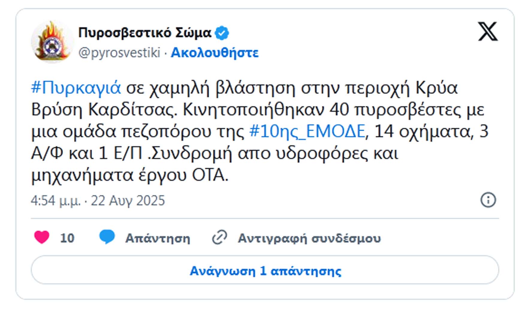«Πυρκαγιά σε χαμηλή βλάστηση στην περιοχή Κρύα Βρύση Καρδίτσας. Κινητοποιήθηκαν 40 πυροσβέστες με μια ομάδα πεζοπόρου της #10ης_ΕΜΟΔΕ, 14 οχήματα, 3 Α/Φ και 1 Ε/Π .Συνδρομή από υδροφόρες και μηχανήματα έργου ΟΤΑ.» έγραψε το Πυροσβεστικό Σώμα, σε ανάρτησή του.