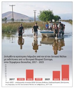 Κορυφή του παγόβουνου του φορτίου νοσηρότητας και θνησιμότητας που δέχτηκαν οι πληθυσμοί στις πληγείσες περιοχές, μετά την καταστροφική πλημμύρα του «Ντάνιελ», είναι οι οι επίσημες καταγραφές των υγειονομικών επιπτώσεων, που κάνουν λόγο για 17 άμεσους θανάτους και εξάρσεις λοιμώξεων από λεπτοσπείρωση, σαλμονέλλωση, κολοβακτηρίδιο και από τον ιό του Δυτικού Νείλου, κατά το πρώτο τετράμηνο μετά τις πλημμύρες, σύμφωνα με την ερευνητική ομάδα του ΚΕΠΥ.