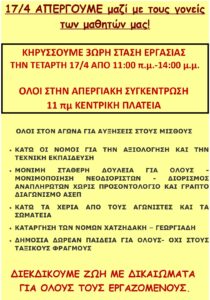 Η απεργία στις 17/4 δίνει τη δυνατότητα να εκδηλωθεί μαζικά η αντίσταση στην αντιλαϊκή κυβερνητική πολιτική, να ενωθούν όλες οι φωνές υπεράσπισης των δικαιωμάτων στην παιδεία, στην υγεία, στο εισόδημα, στη σταθερή και μόνιμη δουλειά, στη ζωή!
