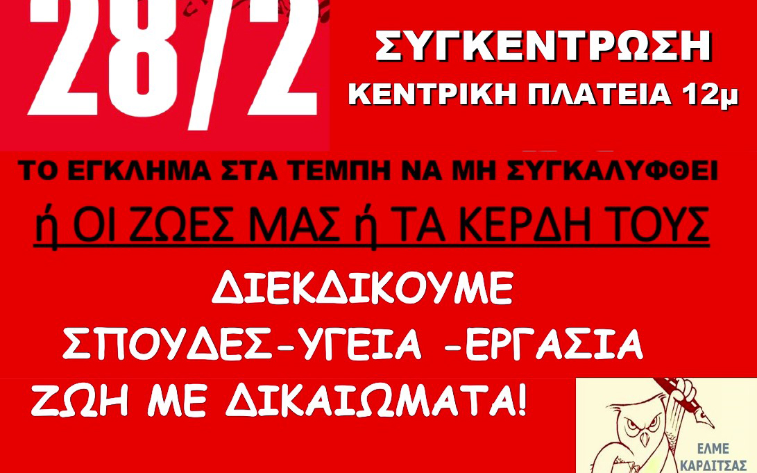 ΤΟ ΕΓΚΛΗΜΑ ΣΤΑ ΤΕΜΠΗ ΔΕΝ ΗΤΑΝ ΜΙΑ ΣΤΙΓΜΗ, ΕΙΝΑΙ ΤΟΥ ΣΥΣΤΗΜΑΤΟΣ Η ΠΟΛΙΤΙΚΗ. Ένα έγκλημα ως αποτέλεσμα της πολιτικής που βάζει το κέρδος πάνω από την ανθρώπινη ζωή Και αυτή η πολιτική του κέρδους, των ιδιωτικοποιήσεων, της απόσυρσης του κράτους από τις στοιχειώδεις υποχρεώσεις του συνεχίζεται και εντείνεται, συντρίβοντας τα λαϊκά δικαιώματα. Η χώρα, οι εργαζόμενοι, η νεολαία μας γίνονται επιβάτες σε ένα τρένο που οδηγεί στη φτώχεια, στην εξαθλίωση, στη βαρβαρότητα. Τρία χρόνια μετά, και τίποτα δεν έχει αλλάξει. Τρία χρόνια μετά, αυτή η πολιτική είναι ακόμα εδώ και συνεχίζει να δολοφονεί: Στο εργοστάσιο «Βιολάντα» στα Τρίκαλα η εργατική τάξη μέτρησε 5 νεκρές εργάτριες, γιατί η εργοδοσία δεν ήθελε να… «ξοδευτεί» για μέτρα ασφαλείας. Μόνο το 2025 σε όλη τη χώρα τουλάχιστον 201 άνθρωποι έχασαν τη ζωή τους στους χώρους δουλειάς, χιλιάδες τραυματίστηκαν. Τα εργοδοτικά και κυβερνητικά εγκλήματα, που βαφτίζονται “ατυχήματα”, δεν είναι ούτε μεμονωμένα περιστατικά, ούτε φταίει «η κακιά η ώρα», όπως προσπαθούν να τα παρουσιάσουν τα επιτελεία κυβέρνησης και εργοδοσίας.