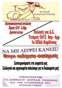 Η Ετήσια εκλογοαπολογιστική συνέλευση της ΕΛΜΕ Καρδίτσας θα πραγματοποιηθεί την Πέμπτη 12/12/2024 στις 6,30μμ στο Εργατικό Κέντρο Καρδίτσας .