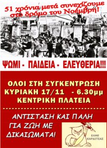 51 χρόνια μετά, ο λαός μας βρίσκεται στη μέγγενη μιας πολιτικής που συνθλίβει εργατικές και λαϊκές κατακτήσεις, ξεπουλά τον δημόσιο πλούτο, διαλύει υγεία και παιδεία, εξαφανίζει κοινωνικά δικαιώματα, για να φέρει στη θέση τους «λιγότερο κοινωνικό κράτος», «λιγότερα δικαιώματα για τους εργαζόμενους», «λιγότερη ζωή για όλους μας». Η ακρίβεια, συνδυασμένη με τους -πάνω από 10 χρόνια- καθηλωμένους μισθούς πείνας, μας οδηγούν σε συνθήκες ακόμα μεγαλύτερης φτώχειας. Στο στόχαστρο βρίσκεται διαρκώς και κάθε συνδικαλιστική δράση. Με τρομοκρατία και καταστολή επιχειρείται «να μπουν στο γύψο» τα σωματεία.