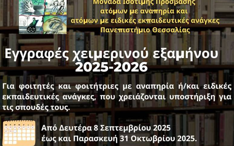 Η Μονάδα Ισότιμης Πρόσβασης του Πανεπιστημίου Θεσσαλίας ξεκινά τις εγγραφές για το χειμερινό εξάμηνο 2025-2026!