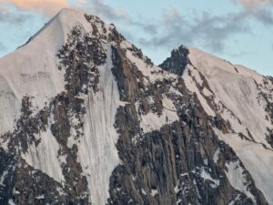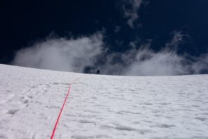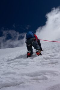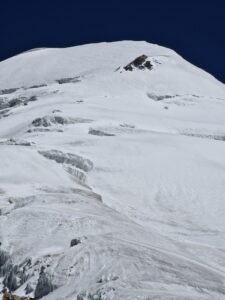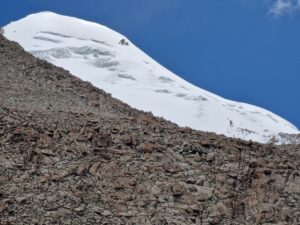 Από εκεί και μετά, όταν προσεγγίζεις την κορυφή, όπως τη φθάσαμε, από τη νότια πλευρά, έχει και ένα ανάγλυφο λόγω του παγετώνα, με πέτρες μετακινούμενες πάνω στον πάγο, το οποίο δυσκολεύει λίγο την πρόσβαση, αλλά, στη συνέχεια, το να σκαρφαλώσεις πάνω, ενώ μέχρι τα 6.000 μέτρα ήταν σχετικά τεχνικά, όχι κάτι το ιδιαίτερο, μετά η κλίση ήταν αρκετά μεγάλη και τα τελευταία 500 μέτρα υψομετρικά ήταν καθαυτού αναρρίχηση μέχρι να φθάσουμε στην κορυφή.