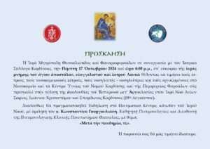 Ο Ιατρικός Σύλλογος Καρδίτσας και η Ιερά Μητρόπολη Θεσσαλιώτιδος και Φαναριοφερσάλων σας προσκαλούν να παρευρεθείτε και να τιμήσετε με την παρουσία σας τις εορταστικές εκδηλώσεις που διοργανώνουμε στα πλαίσια του εορτασμού του Αγίου Λουκά του Ευαγγελιστού, Αποστόλου και Προστάτου των Ιατρών, την Πέμπτη 17 Οκτωβρίου στις 6:00 το απόγευμα στον Ιερό Αγίων Σοφίας, Ιωάννου Χρυσοστόμου και Σπυρίδωνος (18ης Αυγούστου).