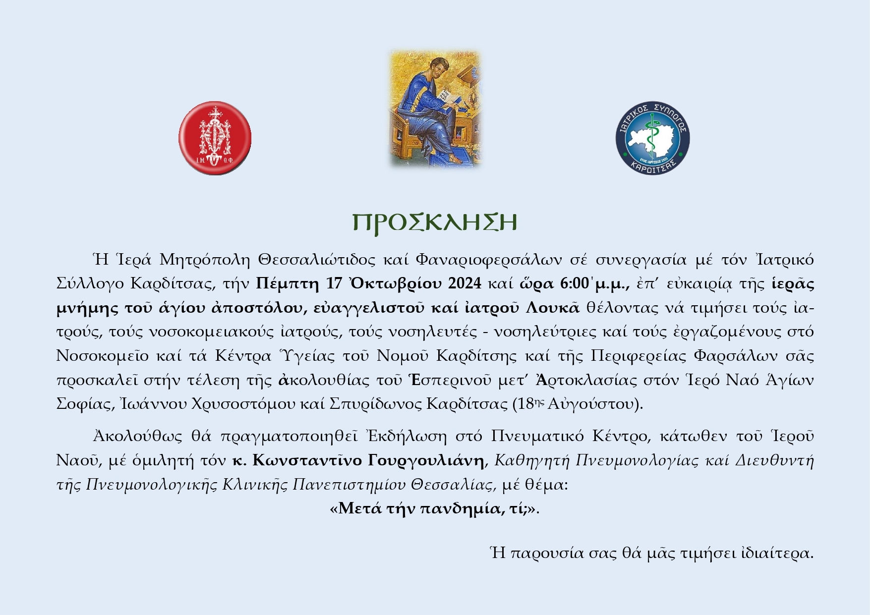 Ο Ιατρικός Σύλλογος Καρδίτσας και η Ιερά Μητρόπολη Θεσσαλιώτιδος και Φαναριοφερσάλων σας προσκαλούν να παρευρεθείτε και να τιμήσετε με την παρουσία σας τις εορταστικές εκδηλώσεις που διοργανώνουμε στα πλαίσια του εορτασμού του Αγίου Λουκά του Ευαγγελιστού, Αποστόλου και Προστάτου των Ιατρών, την Πέμπτη 17 Οκτωβρίου στις 6:00 το απόγευμα στον Ιερό Αγίων Σοφίας, Ιωάννου Χρυσοστόμου και Σπυρίδωνος (18ης Αυγούστου).