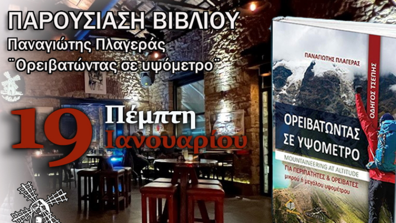 Σήμερα Πέμπτη 19 Ιανουαρίου στο kafe-pub Μύλος (Δημοκρατίας 1-Καρδίτσα) παρουσιάζουμε το βιβλίο του Παναγιώτη Πλαγερά “Ορειβατώντας σε υψόμετρο”. Είναι το απόσταγμα πολλών αναβάσεων του συγγραφέα σε όλα τα μήκη και πλάτη του πλανήτη, ένα ταξίδι γνωριμίας στον κόσμο της ορειβασίας για ασφαλέστερες εξορμήσεις.