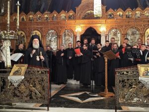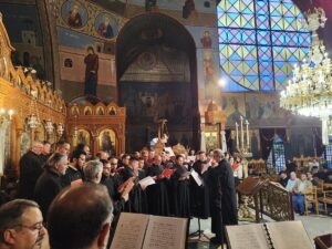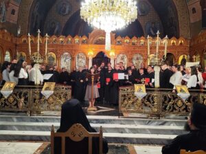 Το απόγευμα του Σαββάτου λοιπόν στον Ιερό Ναό Αγίου Γεωργίου Καρδίτσας πραγματοποιήθηκε Συναυλία Βυζαντινής Μουσικής με τη συμμετοχή διπλωματούχων, πτυχιούχων, τελειοφοίτων και σπουδαστών/στριών της Σχολής, οι οποίοι έψαλαν Ύμνους του Τριωδίου των Ρόδων – περιόδου του Πεντηκοσταρίου στα ελληνικά και σλαβωνικά υπό την διεύθυνση των κ. Ιωάννου Παπαχρόνη και κ. Ηλιού Καπέλα.