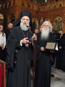 Τέλος, όχι ως επιστέγασμα της συνεργασίας τους αλλά ως συνέχιση αυτής τίμησε, με τη σύμφωνη γνώμη και του Διευθυντού της Σχολής, τον τέως Διευθυντή της Σχολής κ. Ιωάννη Παπαχρόνη για την μακροχρόνιο, πολύτιμο και πολύπλευρο προσφορά του στην τέχνη της Ψαλτικής και της Διδασκαλίας εν γένει και δη στη Σχολή Βυζαντινής Μουσικής «Άγιος Ιωάννης ο Δαμασκηνός» της Ιεράς μας Μητροπόλεως, την οποία διακόνησε ανιδιοτελώς επί 12 έτη (2008 – 2020) καθιστώντας την ως μία από τις καλύτερες Σχολές της πατρίδος μας.