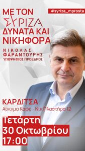 Την Καρδίτσα επισκέπτεται ο Ευρωβουλευτής και Υποψήφιος Πρόεδρος του ΣΥΡΙΖΑ ΠΣ Νικόλας Φαραντούρης. Την Τετάρτη 30 Οκτωβρίου στις 17:00 στο Αίνιγμά Καφέ (Ν.Πλαστήρα 12) θα πραγματοποιήσει ομιλία όπου θα παρουσιάσει το σχέδιό του για την ενότητα του χώρου, τους άξονες για την ανασυγκρότηση του ΣΥΡΙΖΑ ΠΣ και την επόμενη μέρα για την Χώρα.