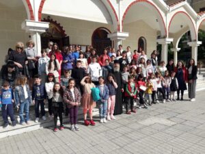 Τα παιδάκια συνόδευαν ο π. Λάμπρος Κρικέλης εφημέριος του Ιερού Ναού, η κατηχήτρια τους και οι γονείς τους.
