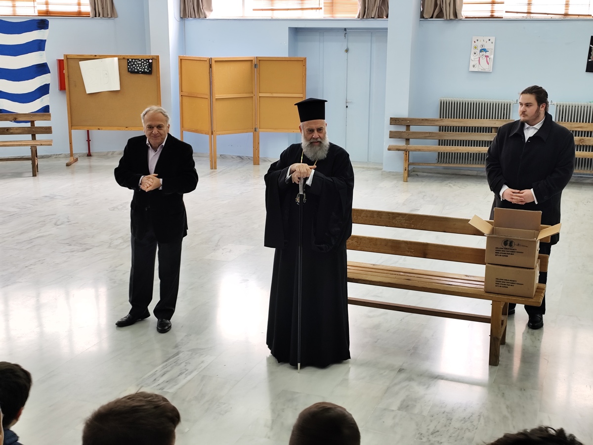 Τον Σεβασμιώτατο υποδέχτηκε ο διευθυντής της σχολικής μονάδος. Ακολούθησε εποικοδομητική συζήτηση με τους μαθητές της πρώτης γυμνασίου, στους οποίους διένειμε τευχίδιο της Καινής Διαθήκης ως ευλογία.