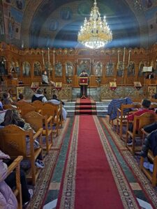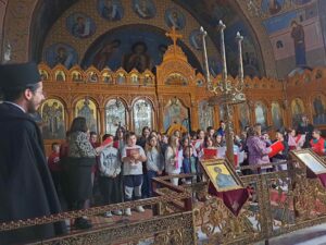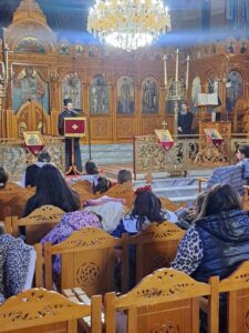 Στη συνέχεια, παρακολούθησε τη χριστουγεννιάτικη πρόβα των παιδιών, διαπιστώνοντας με ιδιαίτερη χαρά τον ζήλο και τον ενθουσιασμό με τον οποίο προετοιμάζονται για τον εορτασμό της μεγάλης Δεσποτικής Εορτής της Γεννήσεως του Χριστού. Η όμορφη αυτή προσπάθεια αποτελεί καρπό της συστηματικής εργασίας των κατηχητών και της στήριξης της τοπικής ενορίας.