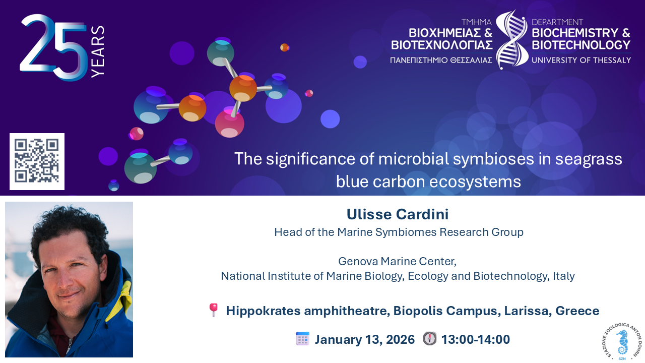 Η διάλεξη εξετάζει πώς οι αλληλεπιδράσεις μεταξύ των θαλάσσιων φυτών και βενθικών ασπόνδυλων (όπως τα δίθυρα μαλάκια της οικογένειας Lucinidae και οι σπόγγοι) επηρεάζουν τους κύκλους του άνθρακα, του αζώτου και του θείου, καθώς και τον τρόπο με τον οποίο οι διεργασίες αυτές ανταποκρίνονται στις περιβαλλοντικές αλλαγές. Μέσα από τη σύνθεση μικροβιολογικών και οικολογικών προσεγγίσεων, αναδεικνύεται η σημασία των συμβιωτικών σχέσεων για την ανθεκτικότητα των οικοσυστημάτων υπό τις συνθήκες της κλιματικής αλλαγής.