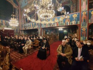 Κατά τη διάρκεια της Ακολουθίας, πραγματοποιήθηκε ομιλία από τον Ελλογιμώτατο κ. Νικόλαο Κόιο, Αναπληρωτή Καθηγητή του Τμήματος Θεολογίας της Θεολογικής Σχολής του Α.Π.Θ., με θέμα: «Μετ-ανθρωπισμός ή Θεανδρικότητα; Μια προσπάθεια αναστοχασμού στις σύγχρονες ανθρωπολογικές προκλήσεις μέσα από τη δυναμική της σκέψης των Τριών Ιεραρχών».