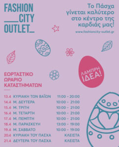 Πασχαλινές αγορές με άνεση και σε καταπληκτικές τιμές, η μόδα στα καλύτερά της, ξεχωριστές δράσεις για μικρούς και μεγάλους και ανοιξιάτικη ατμόσφαιρα που «ανοίγει την καρδιά μας»… Αυτό είναι το παζλ της πασχαλινής εμπειρίας στο Fashion City Outlet.